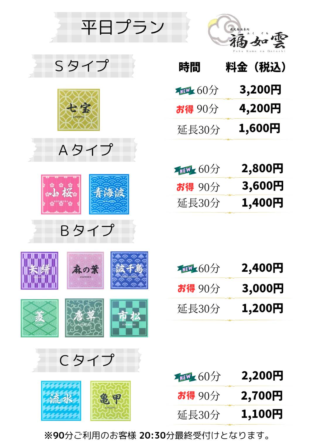 ①各プランのご利用時間&延長料金のお知らせ