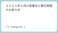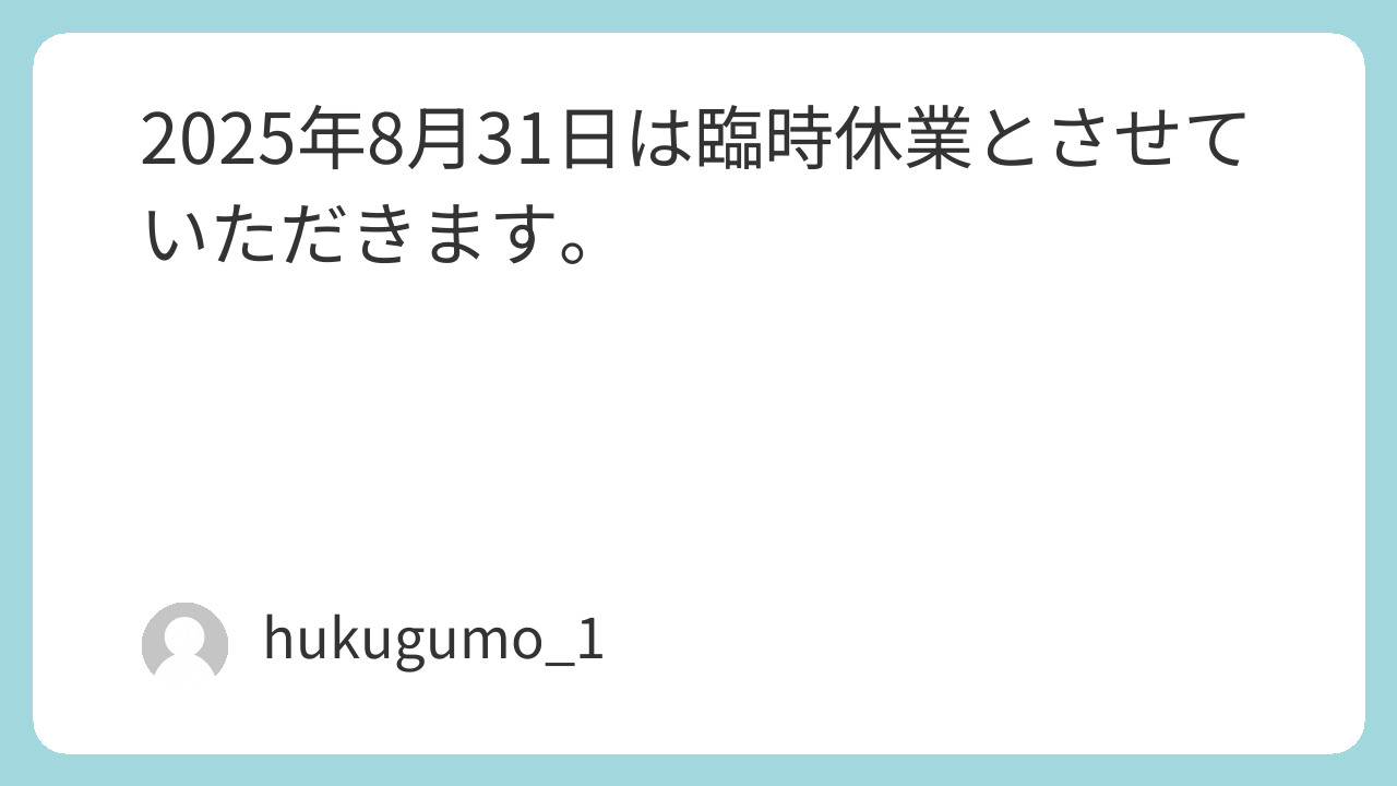 2025年8月31日は臨時休業とさせていただきます。 お知らせ 2025.08.28 2025年8月31日は、諸事情により、臨時休業とさせていただきます。 お客様にはご不便をおかけして恐縮ですが、よろしくお願いいたします。